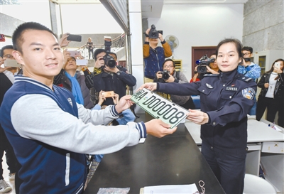 11月20日,在福州市交警支队车辆管理所,民警向市民林先生发放当地第一张新能源汽车专用号牌。当日起,我国12个城市第一批统一启用新能源汽车专用号牌。 新华社记者 宋为伟 摄