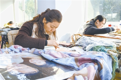 11月22日,在苏州市高新区苏绣小镇,国家级非物质文化遗产(苏绣)代表性传承人王丽华(左)在工作室内加工苏绣作品。