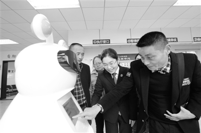 11月21日,在四川省崇州市人民法院,工作人员正在介绍法律机器人“小崇”的功能和使用方法。