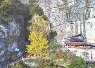 空中俯瞰浙江省建德市大慈岩景区的古银杏树(11月23日摄)。