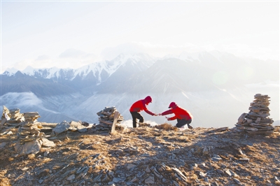 科研人员刘巧(左)、冉飞在贡嘎山西坡采集植物样本(11月23日摄)。