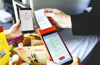 11月26日,乘务人员使用“铁道宝”智能支付POS机为旅客提供微信支付服务。