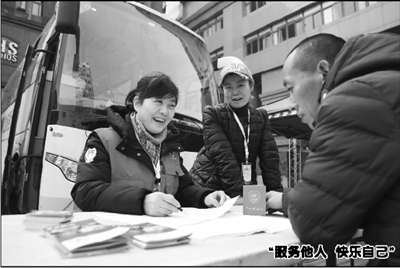 11月26日,在重庆市北碚区,身为环卫工人的“碚城义工”志愿者焦兴惠(左一)在义务献血车前做志愿服务。在北碚区,活跃着一群由市民自发组织的志愿服务组织“碚城义工”。“碚城义工”成立于2009年,志愿者人数从最初的20多人增加到现在的600多人。8年来,志愿者们利用业余时间,开展关爱老人、清洁环境、义卖助学等志愿服务,以“服务他人 快乐自己”的精神,向社会传递正能量。 秦廷富 摄 (新华社发)