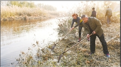 山东省邹平县高新街道东吕村村级河长卢新(右一)和工作人员一起在孝妇河边清理杂草(11月21日摄)。