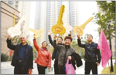 11月28日,部分回迁居民在小区内手举新房钥匙模型庆祝分得新房。