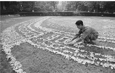 11月28日,成都郫都区置信逸都小区的园林工杨光廷用银杏叶拼成图案让业主们观赏。一到秋天,他时常蹲坐在草坪中,以扫帚为笔,银杏为墨,草地为纸,利用飘落的银杏叶创作出不同的造型图案,给小区居民们带来美的享受。