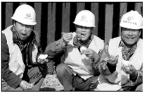中铁十局济青高铁胶州北工程工地上,工人们正乐滋滋地吃着热乎乎的午餐。