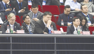 中国篮协主席姚明(前排中)在看台观看男篮比赛。新华社记者 李博 摄