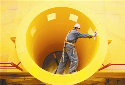 12月3日,一家公司的员工对海上风力发电打桩架进行打磨作业。