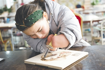 12月3日,石家庄市的河北百年巧匠木绘艺术工坊,来自新疆残疾人职业中专学校的玛达娜·达木在创作木绘板画作品。