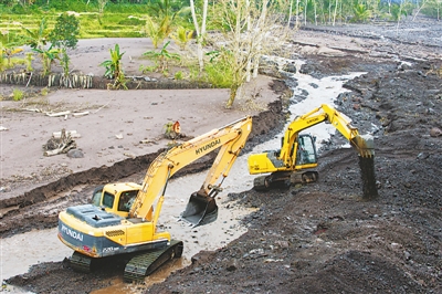 12月4日,挖掘机正在疏通印度尼西亚巴厘岛阿贡火山附近一条被火山灰阻塞的河流。