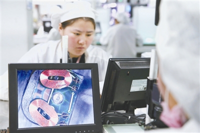 12月8日,工人在安徽淮北一家手机马达生产企业的生产线上组装手机微特马达。