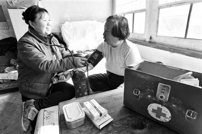 12月5日,扎根大庄科乡慈母川村的村医郭建峰在为老人量血压。