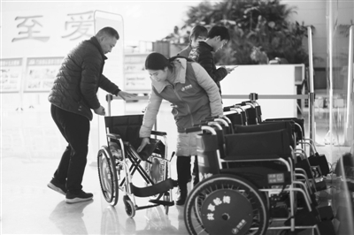 12月6日,在北京解放军301医院门诊楼一层北门避风阁以及西门避风阁内,在志愿者的引导下,20辆左右共享轮椅随时为患者提供服务。使用共享轮椅时,只需要微信扫描二维码,经过实名认证,登录后交付99元押金即可使用。一名志愿者介绍,目前全天免费使用,押金随时可退,将在10个工作日内原路返还。还车时您只需推回原来的位置,关锁后在手机上提交还车申请即可。本报记者 吴凡 摄