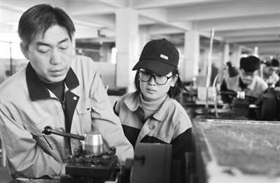 12月12日,泊头市职教中心学生在老师(左)的指导下操作车床。