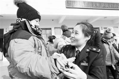 12月13日,志愿者为安徽省淮北市渠沟镇平楼小学学生穿上崭新的棉衣。