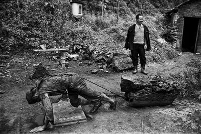 1996年5月15日,贵州省毕节市赫章县野马川乡48岁的小煤窑矿主李小才与他雇佣的一位贵州安顺籍矿工在他的小煤窑井口处。