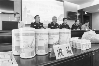 12月11日,警方在发布会现场展示部分假冒保健品成品。