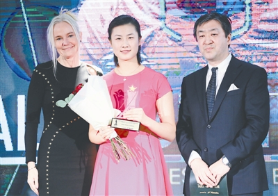 当日,国际乒联2017年度颁奖典礼在哈萨克斯坦首都阿斯塔纳举行,中国选手丁宁同时收获年度最佳女运动员奖和年度最佳得分奖。 新华社发(奥斯帕诺夫摄)