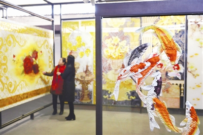12月16日,河北省沙河市宝石来玻璃有限公司工作人员在向客商介绍艺术玻璃制品。