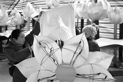 目前,湖北省恩施土家族苗族自治州宣恩县近百名彩灯制作工人正加紧制作大型彩灯组,为当地在县城贡水河畔举行的迎新年大型彩灯展作准备,迎接元旦、春节到来。