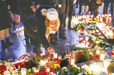 12月19日,在德国首都柏林的布赖特沙伊德广场,一名女子在圣诞市场恐袭一周年纪念活动上放置蜡烛。