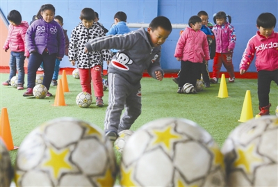 近日,该园小朋友拥有了一座高标准“室内足球场”,在寒冷的冬季里也能踢上“温暖足球”。这座球场由当地教育部门筹资建设,占地面积287平方米,让小朋友无论严寒酷暑都能开展足球运动,从中获得快乐。 陈彬 摄