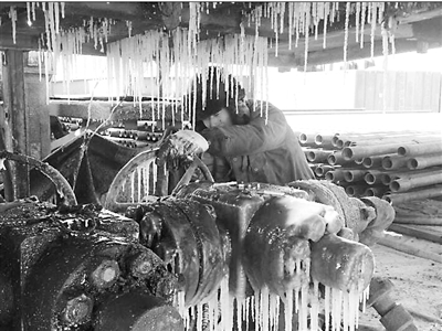 图为12月13日,在南堡41-32井,该公司作业三队工人正在检查闸门是否冻堵。