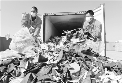 12月21日,工人在厦门海关的海沧查验场清理查获的进口牛皮革“洋垃圾”。
