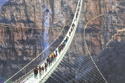 当日,位于河北省平山县红崖谷景区的悬跨式玻璃桥正式开放。该桥横架两座山峰之间,紧邻景区环山栈道,桥梁采用悬索结构,桥面全部采用航空夹胶玻璃,厚度达4厘米。该桥全长488米,宽4米,桥面与地面垂直落差约218米,可容纳600人同时通过。
