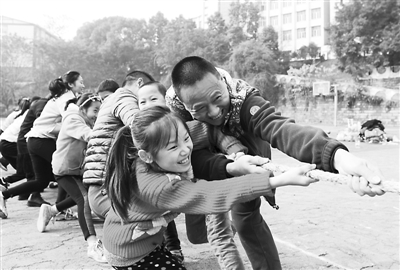 12月24日,重庆市永川区松溉镇卫生院向帮扶的10名留守儿童赠送了书籍、文具、羽毛球等慰问品,并为他们讲解了个人卫生注意事项、疾病预防常识等卫生知识。同时,还组织开展了趣味运动会。图为医务人员和留守儿童一起进行拔河比赛。陈仕川 摄