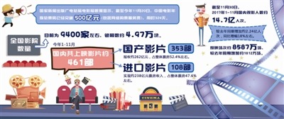 国家新闻出版广电总局电影局数据显示,截至2017年11月30日,1~11月国内观影人数约14.7亿人次,较去年同期增加约2.24亿人次,同比增幅18%左右;放映场次约8587万场,较去年同期增加约1812万场,同比增幅近27%;全国影院数量目前为9400家左右,银幕数约4.97万块。
