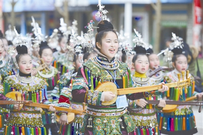 当日,2017中国侗年暨第八届黎平·中国侗文化旅游节“非遗”文化巡游在贵州省黔东南苗族侗族自治州黎平县举行,当地侗族同胞欢聚一堂,喜迎侗年到来。 新华社 杨文斌 摄