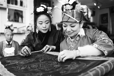 12月24日,妇女们在交流苗绣技艺。近年来,贵州省黔东南苗族侗族自治州台江县通过“互联网+企业+农户”的模式促进农村妇女增收。该县联系电商平台、各大企业和本地合作社,打通销售渠道,帮助广大绣娘在冬闲时节实现家门口增收。 刘开福 (新华社发)