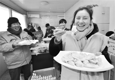 当日,河北石家庄公交一路车队的志愿者来到广安大街环卫工人休息室,为环卫工人送来冬储白菜和大米等爱心物品,并为环卫工人包饺子,送上冬日温暖。董永博 摄(新华社发)
