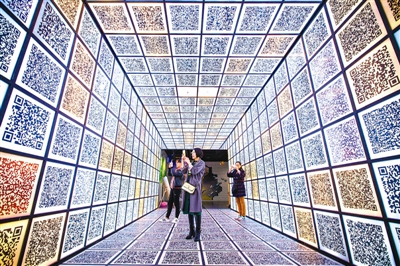 2017年4月6日,市民在南京一商场内的“二维码隧道”扫码。这条“隧道”由400个品牌广告、创意游戏的二维码组成。