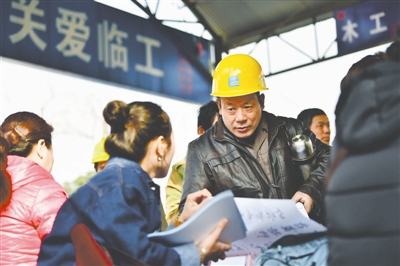安徽合肥市常青街道在凌大塘临工集散中心举办“关爱临工专场公益招聘会”,求职者与用工企业招聘人员交流(3月4日摄)。