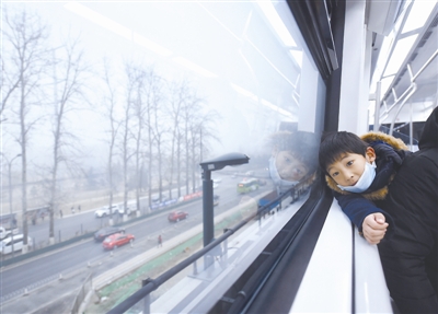 12月30日,一名小朋友坐在新开通的燕房线车厢内向外张望。