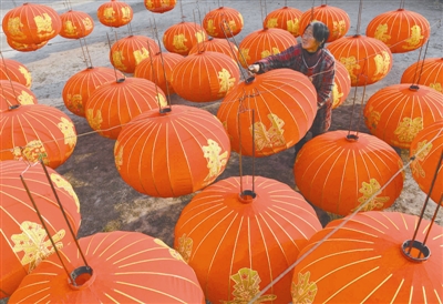 2017年12月26日,在山西省稷山县稷峰镇杨赵村灯笼产业园内,一名工人在晾晒红灯笼。