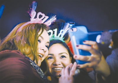 1月1日,在美国旧金山,两名女子在焰火表演期间合影留念。