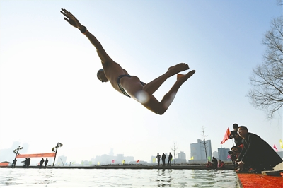 1月1日,一名冬泳爱好者跃入水中。