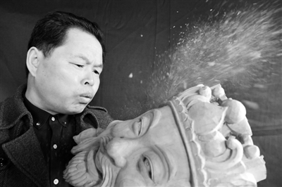 在江西省萍乡市湘东区,湘东傩面具传承人彭国龙正在清除一个初步成型的傩面具上的木屑(2017年12月28日摄)。