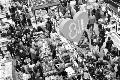 沿着沈阳市中街步行街一路走过去,人头攒动。步行街东头的沈阳大悦城内贴着“全场商品5折起”“一件8.5折、两件8折、三件7.5折”的招牌。西头的沈阳兴隆大家庭门前,促销员正派发着“史上最大力度”“满3000送200兴隆卡”的宣传单。一路上,“满99减50”“购物送50倍积分”“抽奖送iphone x”等一拨拨的打折潮让记者应接不暇。