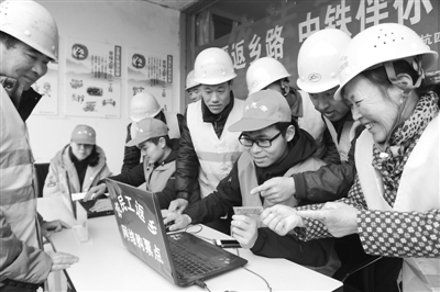 1月3日,在安徽合肥一项目部驻地,青年志愿者通过互联网为农民工订购春运火车票。当日,2018年春运首日火车票在网络、电话平台开售。