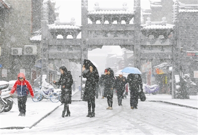 1月3日,在湖北襄阳古城街头,市民冒雪出行。