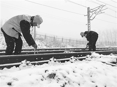 1月3日,河南南阳地区迎来今年第一场降雪。南阳车务段桐柏车站启动应急预案,组织人员及时清扫道岔积雪,确保列车安全畅通。赵向阳 摄