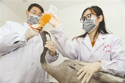 1月4日,沧州野生动物救护中心的工作人员对一只患病灰鹤进行药物治疗。