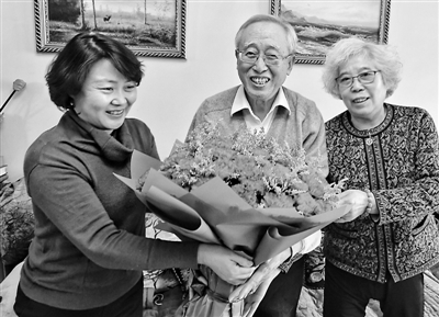1月4日,北京市丰台区东高地街道工委副书记杨柳(左)向老一代航天科研人员张允中(中)、刘振茹夫妇赠送鲜花。