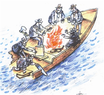 舟行江中恰遇北风冷峭,乘船人饥寒交迫,本应全体奋力登岸躲避,几位老兄竟拆木点火取暖,这无疑是“饮鸩止渴”!