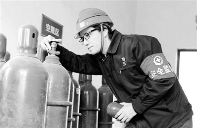 图为近日,该公司员工在认真检查工业气体瓶的安全配置。王汉强 摄